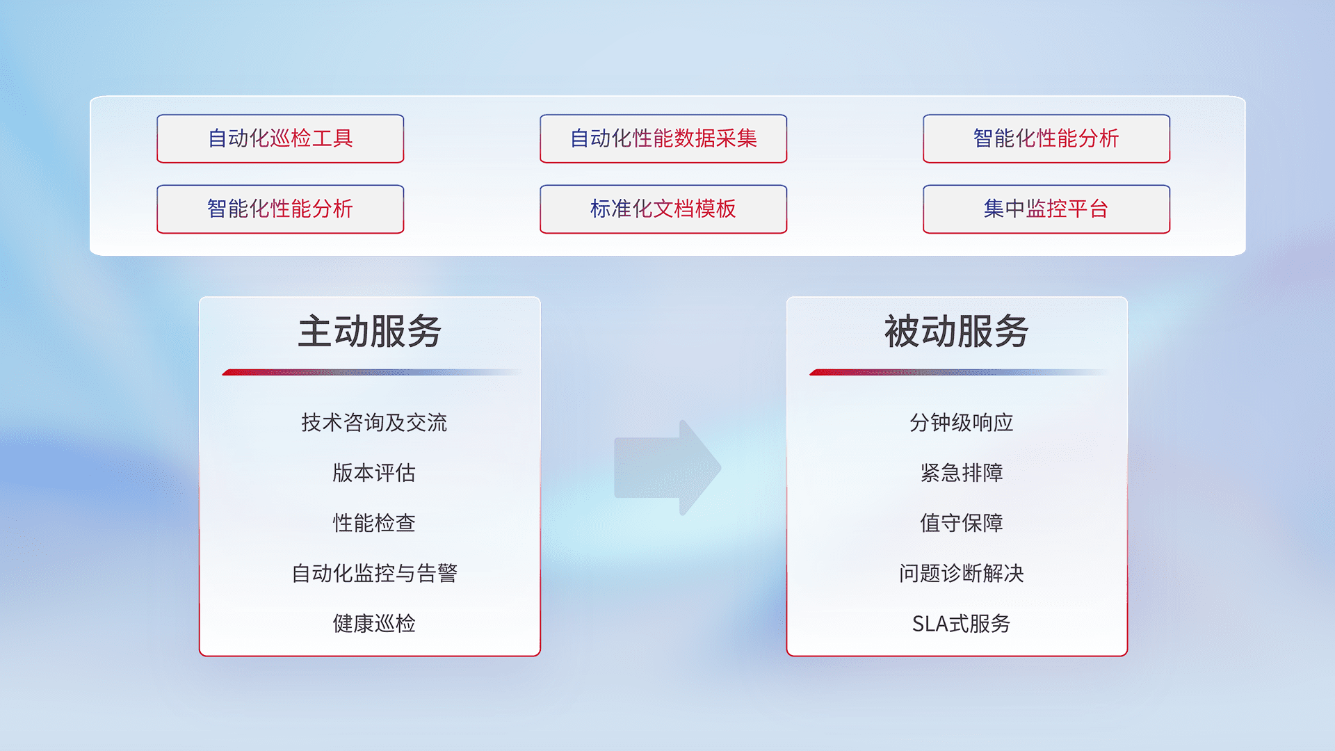 智能化工具和标准化文档,,保障服务质量,,提供主动服务(包含技术咨询、、版本评估、、、性能检查、、、、自动化监控与告警、、健康巡检)和被动服务包含(分钟级响应、、、、紧急排障、、值守保障、、、问题诊断解决、、SLA服务)。。。